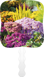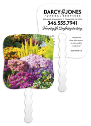 Stay cool and spread your message with this beautifully designed hand-held paper fan featuring an uplifting image on the front and your imprint on the back. Perfect for so many occasions, it combines practicality with a meaningful message, adding elegance to your event while keeping attendees feeling refreshed. The FSC® label means that the materials used for this product come from well-managed FSC®-certified forests and other controlled sources.