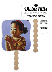 Stay cool and spread your message with this beautifully designed hand-held paper fan featuring an uplifting image on the front and your imprint on the back. Perfect for so many occasions, it combines practicality with a meaningful message, adding elegance to your event while keeping attendees feeling refreshed. The FSC® label means that the materials used for this product come from well-managed FSC®-certified forests and other controlled sources.