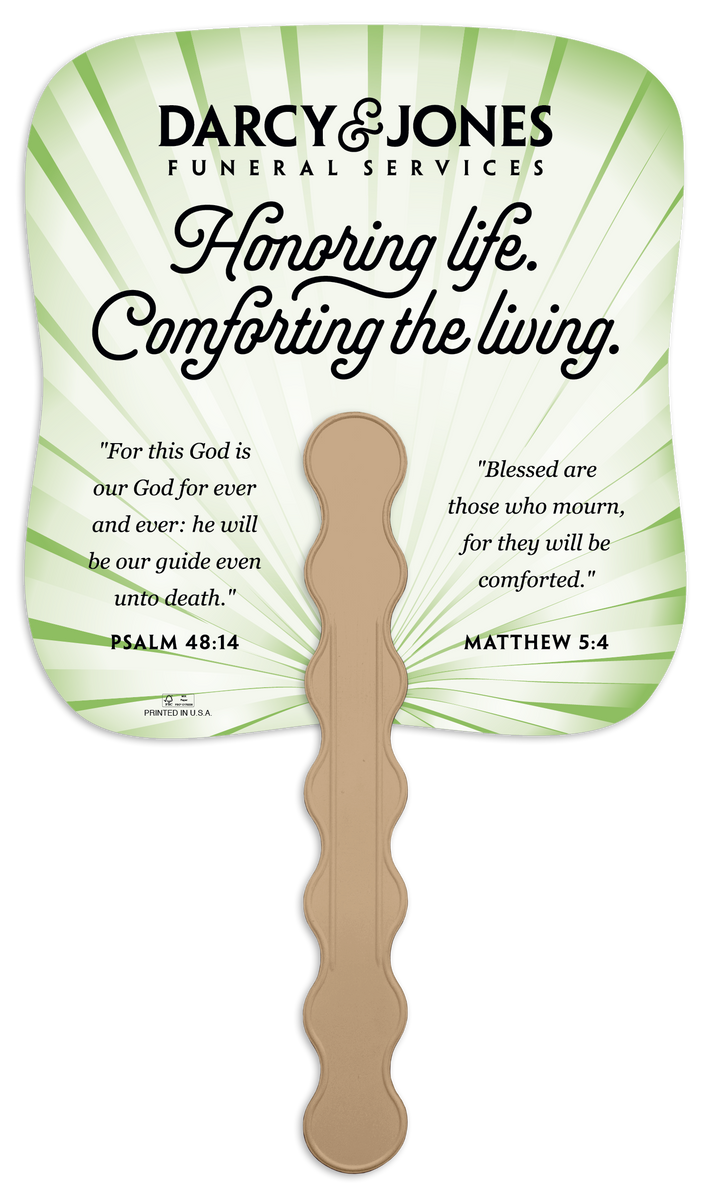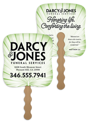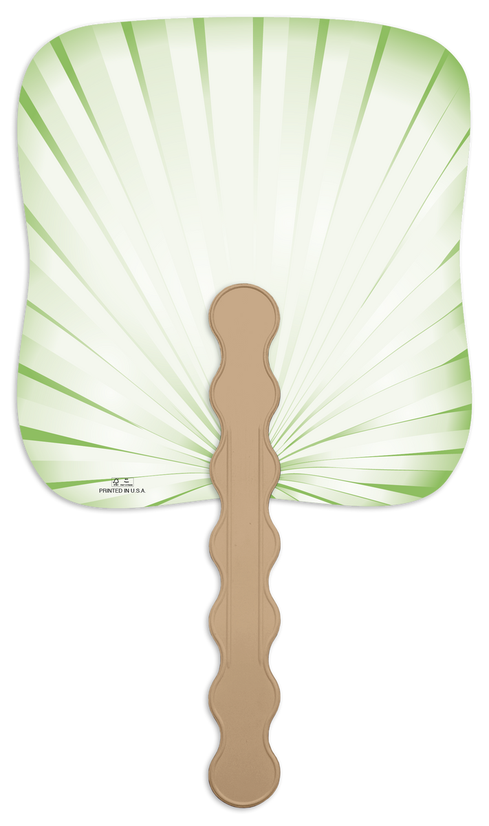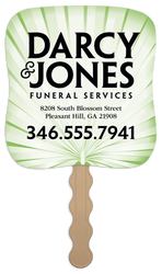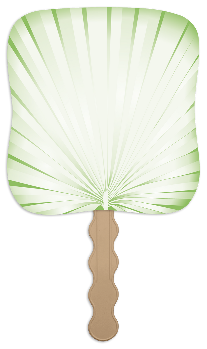 These paper fans feature a green palm leaf pattern with a subtle sunburst effect, offering a sophisticated touch to the design. Your custom imprint in black ink stands out clearly, making these fans both practical and stylish for events, churches, memorial services, and more. The FSC® label means that the materials used for this product come from well-managed FSC®-certified forests and other controlled sources.