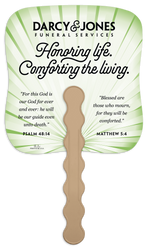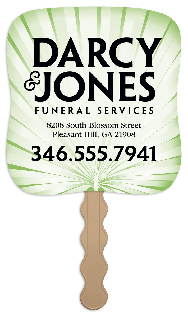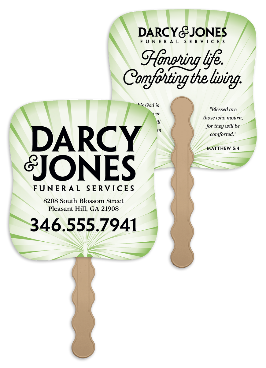 These paper fans feature a green palm leaf pattern with a subtle sunburst effect, offering a sophisticated touch to the design. Your custom imprint in black ink stands out clearly, making these fans both practical and stylish for events, churches, memorial services, and more. The FSC® label means that the materials used for this product come from well-managed FSC®-certified forests and other controlled sources.